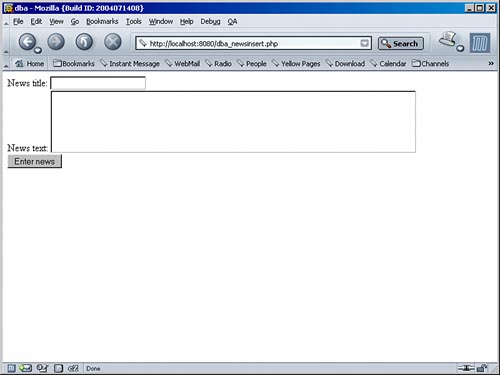 Listing 26.7 implements all this; Figure 26.3 shows how this looks in the Web browser. Listing 26.7. Entering Data into the News Database